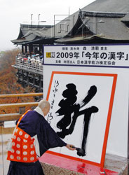 中新網(wǎng)12月11日電 據(jù)日本共同社報道,日本漢字能力檢定協(xié)會11日在京都清水寺宣布“新”字被選為象征2009年日本世態(tài)的漢字。據(jù)該協(xié)會介紹,征集活動共收到161365件應(yīng)征信,再次刷新去年所創(chuàng)的歷史最高紀(jì)錄。其中14093件選擇了“新”字,占總數(shù)的8.7%。