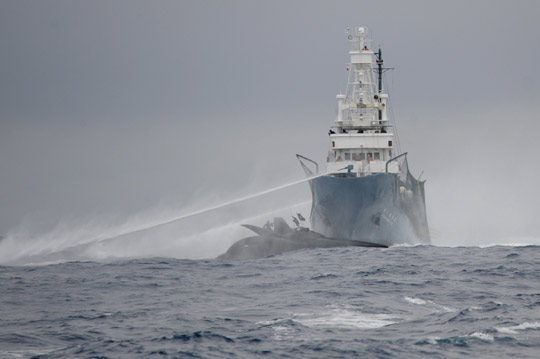 據(jù)英國廣播公司報道,名為阿迪·基勒的快艇在事件中嚴(yán)重受損,但是艇上的六個人獲救!昂I夏琳摺钡陌l(fā)言人說,日本捕鯨船的做法已經(jīng)使得彼此間的沖突變成“真正的鯨魚大戰(zhàn)”。