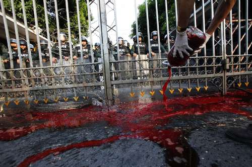 紅衫軍在曼谷的示威行動(dòng)在十六日第二度升級(jí),示威者們將從自己體內(nèi)抽出的鮮血匯集在一個(gè)個(gè)塑料桶內(nèi),潑在總理府門前。這也是此次號(hào)稱“歷來(lái)規(guī)模最大的”集會(huì)示威過(guò)程中,首次“見(jiàn)血”。