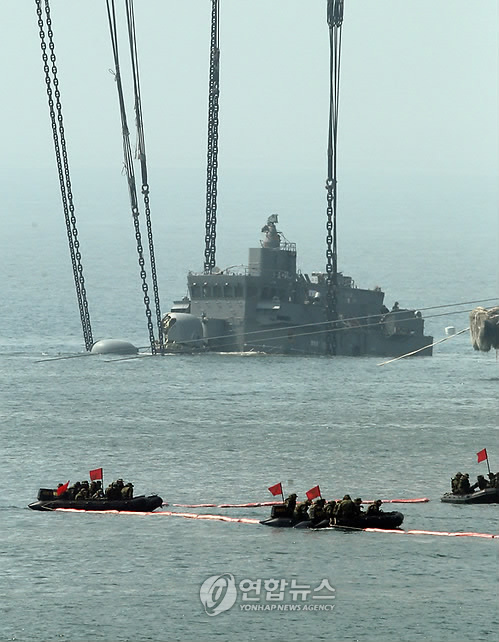 中新網(wǎng)4月23日電 據(jù)韓聯(lián)社報(bào)道,韓國(guó)軍方和打撈公司從當(dāng)?shù)貢r(shí)間23日上午8點(diǎn)49分起,開始把“天安”艦船頭扶正。未過(guò)多時(shí),往右邊傾斜的船頭漸漸浮出水面,露出寫著“天安”艦識(shí)別編號(hào)“772”的部位和艦橋。