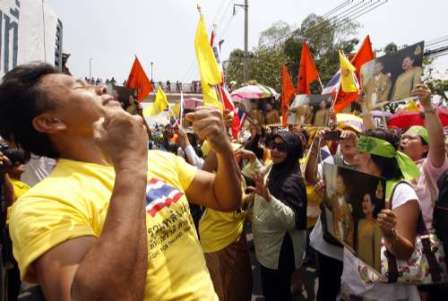 有大約300名親政府的“黃衫軍”周四到總理阿披實坐鎮(zhèn)的曼谷11步兵營外面集會,要求政府采取明確方案,以結束紅衫軍的“非法集會”和“恐怖主義”,并要求軍方運用力量,結束目前的混亂狀態(tài)。