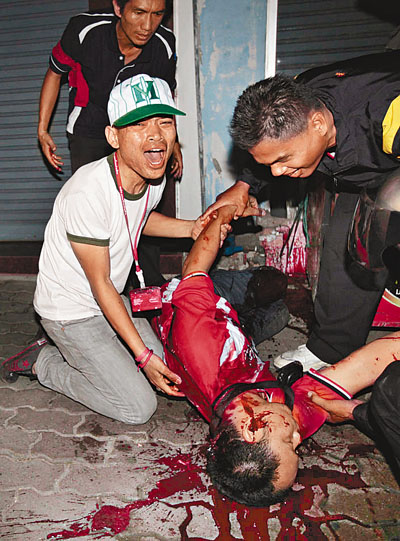 納塔武對記者說:“阿披實(shí)已為內(nèi)戰(zhàn)揭開序幕了。我們緊急要求政府撤軍,停止一切暴力行為。如果阿披實(shí)不同意;穑也恢牢覀兡芊窕钸^今晚。我們希望阿披實(shí)不想要戰(zhàn)爭。”