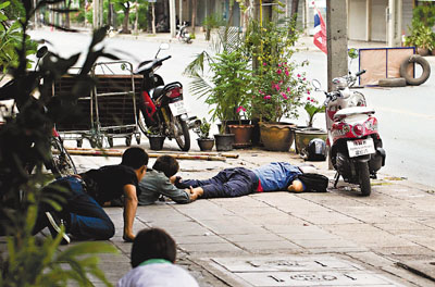 在示威區(qū),有居民自設圍欄,以免紅衫軍逃走時闖進。部分居民更急急收拾細軟離開。46歲的拉達與女兒拖著行李離開時說:“他們關(guān)掉所有燈,我們已沒有食物……過去兩晚最危險,所以要離開!