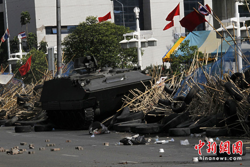 中新網(wǎng)5月19日電 據(jù)外電報(bào)道,19日泰國(guó)軍方對(duì)聚集在首都曼谷市示威的反政府“紅衫軍”展開(kāi)了驅(qū)散行動(dòng),據(jù)信軍方裝甲車已突破“紅衫軍”所筑路障,且至少有3人被槍擊中。