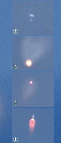 韓國最大的國營電視臺(tái)KBS拍到的畫面顯示:①圖升至距地面70公里高空的“羅老”號(hào)的火焰開始是紅色的,②圖接著火焰變大,呈現(xiàn)類似爆炸后的景象,③火焰越變?cè)酱,并向下掉落。④火焰消失后,被推測(cè)認(rèn)為是“羅老”號(hào)的白色物體開始向下墜落。