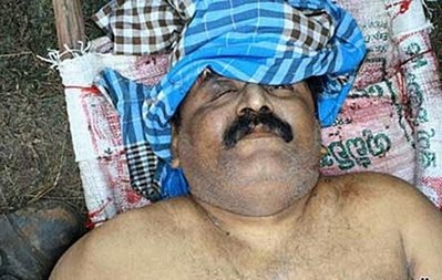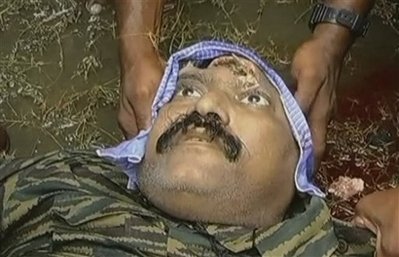 斯里蘭卡國家電視臺播放的錄像畫面顯示,一個看上去很像是泰米爾猛虎反叛組織領(lǐng)袖的尸體,身穿迷彩服,頭的頂部蓋著一塊布,顯然是遮掩一個傷口。