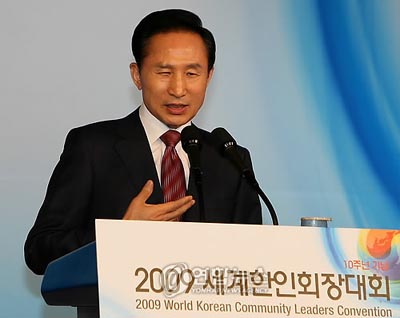 李明博當(dāng)天出席在首爾的華克山莊舉行的2009年世界韓人會(huì)長大會(huì),通過賀詞說出了此番話。