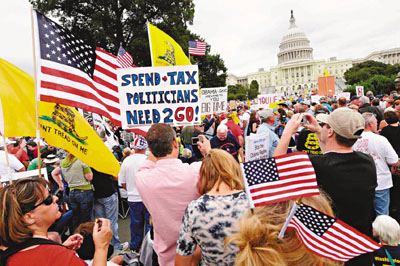 示威者逼爆賓夕法尼亞大道,連綿數(shù)個(gè)街區(qū),齊向國(guó)會(huì)山莊浩浩蕩蕩前進(jìn)。他們高舉奧巴馬和美國(guó)眾議院議長(zhǎng)佩洛西的肖像,以及寫(xiě)滿“不要更多的開(kāi)支,不要更多的稅收,不要更多的謊言”、“支持奧巴馬的醫(yī)療改革方案等于自殺”等各種各樣的標(biāo)語(yǔ)。
