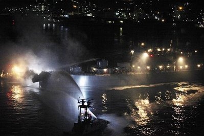 綜合此間報(bào)道,事發(fā)現(xiàn)場位于連接福岡縣北九州市與山口縣下關(guān)市兩市的關(guān)門橋正西約一公里的海面。兩船相撞后,KURAMA號的船頭和“CARINA STAR”號的集裝箱同時(shí)起火,火勢在半個(gè)多小時(shí)后得到控制,至少有三名自衛(wèi)隊(duì)成員在救火過程中受傷。
