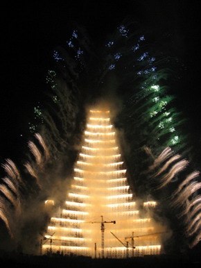 看點二是“強盛大國的火花”、“我們將勝利”兩場煙火晚會。4月14日晚,一場旨在紀念金日成主席誕辰97周年、宣誓邁向強盛國家的煙火表演照亮了平壤的夜空。隨著聲聲炮響,五顏六色、造型各異的美麗煙火依次騰空,把大同江上下游兩座橋之間的區(qū)域變成了煙火的海洋。朝鮮最高領(lǐng)導人金正日同志的出場令全場氣氛格外高漲,掌聲和歡呼聲回蕩在大同江的兩岸。有意思的是,13日、15日平壤下了兩場春雨,唯獨14日萬里晴好,給煙火表演留下了完美的時間窗口。5月1日在柳京大廈舉行的焰火晚會更具特色,巨大的樓體第一次流光溢彩,散發(fā)出美麗的火光,那神奇的景象讓人難忘。
