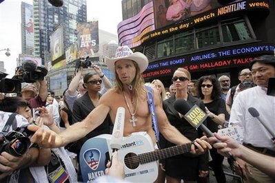 中新網(wǎng)7月23日電 美國紐約知名度頗高的街頭藝人“裸體牛仔”宣布要競選紐約市長,他承諾要把他的穿著風(fēng)格、也就是不穿,落實(shí)在施政上,讓政治更透明。