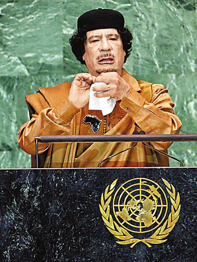 唐娜報道,據(jù)英國《泰晤士報》9月26日報道,利比亞領(lǐng)導(dǎo)人卡扎菲日前在聯(lián)合國大會發(fā)表演講,這是他執(zhí)政40年來首次在聯(lián)大會議上發(fā)言?ㄔ凄┼┎恍莸刂v了100分鐘,為他擔(dān)任口譯的人員幾乎崩潰,以致于當(dāng)場失態(tài)地大聲抱怨。