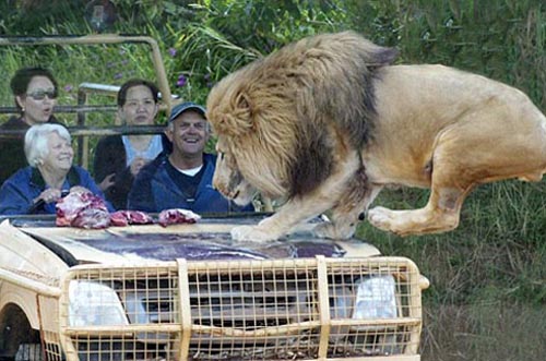 園方巧妙設(shè)置的吉普車,強(qiáng)化玻璃恰好就在擋風(fēng)玻璃處隔開籠內(nèi)與籠外,工作人員還在引擎蓋上放生肉吸引獅子跳上來,也讓游客能近距離觀賞。獅子大塊咬肉的模樣真夠嚇人,不少游客坐在車中都覺得自己彷佛就要成為猛獅的點(diǎn)心了。