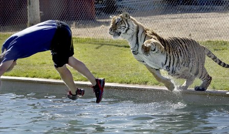 中新網(wǎng)3月5日電 據(jù)英國(guó)《每日郵報(bào)》4日?qǐng)?bào)道,美國(guó)亞利桑那州的非洲野生動(dòng)物公園里有6只威猛的孟加拉和西伯利亞虎,每天它們中的2只都會(huì)進(jìn)行一項(xiàng)看上去非常危險(xiǎn)的游戲——撲向泳池,與它們的飼養(yǎng)員“嬉戲玩鬧”半小時(shí)。