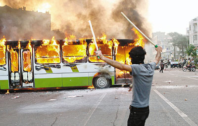 他說示威隊(duì)伍約1000人,后來大批駕駛電單車的軍警人員逼近,毆打他們,人群四散躲避之際,民兵卻帶著棍棒在小巷里埋伏。示威者霎時(shí)間無路可退,幸得巷里人家開門營(yíng)救。當(dāng)示威者遠(yuǎn)離警察和民兵后,便高呼“伊朗已變成巴勒斯坦”等口號(hào),駛經(jīng)的汽車都響號(hào),公共汽車乘客揮手支持。