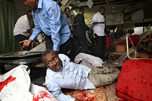 爆炸發(fā)生在摩加迪沙當(dāng)?shù)赜忻摹吧衬频辍,索馬里貝納迪爾大學(xué)計算機(jī)和工程系的學(xué)生正在酒店新裝修過的舞廳里舉行畢業(yè)典禮,不料儀式進(jìn)行到一半時現(xiàn)場發(fā)生劇烈的爆炸。據(jù)悉,雖然只有43名大學(xué)生當(dāng)天畢業(yè),但邀請的賓客很多,多名索過渡政府要員參加了典禮。