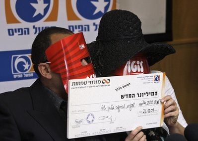 中新網(wǎng)4月15日電 據(jù)美國媒體報道,以色列一對夫婦13日現(xiàn)身領(lǐng)取了以色列最大數(shù)額彩票頭獎,共2000萬美元獎金。他們頭戴面具掩藏自己的身份,并稱一直都不知道這張已經(jīng)握了4個月的彩票中了大獎。