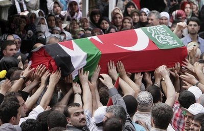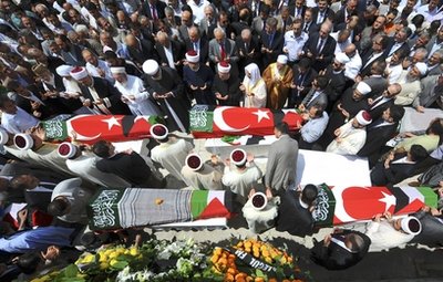 周四(3日),九名死者的尸體被從以色列運(yùn)回土耳其。450多名活動(dòng)人士也一同抵達(dá),他們受到英雄般的歡迎。九名死者都是土耳其人或出生在土耳其,他們的棺材上覆蓋著土耳其和巴勒斯坦的國旗。