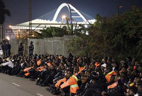 約150名的保安人員從摩西馬比哈達(dá)球場(chǎng)附近出發(fā),一路載歌載舞行進(jìn)到繁華的市中心。隨著不斷人數(shù)的不斷加多,示威者又有秩序地返回到球場(chǎng),守候在那里的數(shù)十名警察將他們控制在一片隔離區(qū)域。