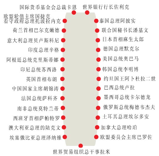 為體現(xiàn)此次峰會的代表性,一些國際和區(qū)域組織的領導人也應邀出席了此次峰會,諸如世界銀行行長佐利克、世貿(mào)組織總干事拉米和國際貨幣基金組織總裁卡恩等。據(jù)悉,佐利克、卡恩及拉米三人分坐在宴會桌的兩頭。