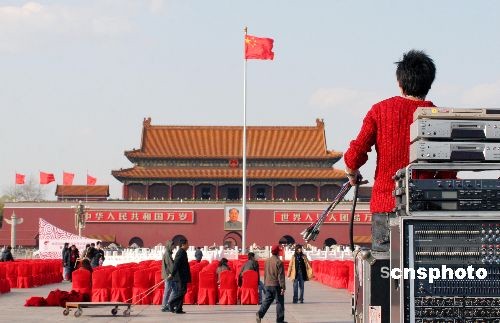 3月30日,工作人員在天安門廣場做搭建“奧運(yùn)圣火臺”的收尾工作、布置場地,迎接即將到來的2008年北京奧運(yùn)會圣火火種歡迎儀式。