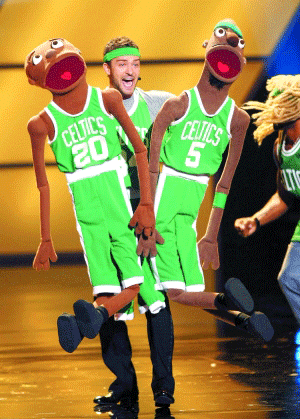 耍球星 賈斯汀拿凱爾特人隊球星開涮。