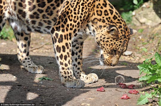 英國媒體5日刊出了一組照片,照片中的小老鼠看來只有兩三個(gè)月大,在動(dòng)物園的喂食時(shí)間稍過不久,便見它蹦蹦跳跳的溜進(jìn)了豹子的地盤。來干嘛?呵呵,偷點(diǎn)小點(diǎn)心嘗嘗唄!