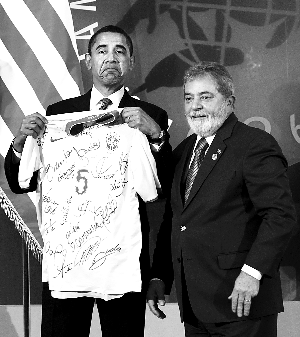 美國總統(tǒng)貝拉克·奧巴馬9日和巴西總統(tǒng)盧拉·達(dá)席爾瓦會面時,雙方大談足球經(jīng),盧拉還送給奧巴馬一件巴西國家男子足球隊成員簽名的球衣。