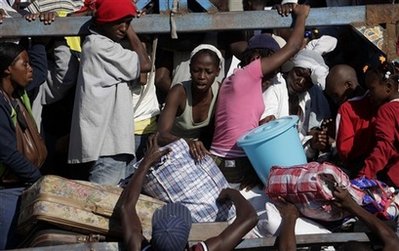中新網(wǎng)1月19日電 據(jù)外電19日報道,數(shù)以千記的海地災(zāi)民爭相擠上開往太子港郊區(qū)的公共汽車,希望在那里能夠更容易的找到食物和水。