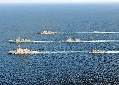 中新網(wǎng)3月17日電 據(jù)韓國《中央日報》報道,3月16日,參加“關(guān)鍵決斷”聯(lián)合軍演的韓國海軍第一艦隊司令部下屬的戰(zhàn)斗艦和美國海軍宙斯盾驅(qū)逐艦正在東海上進行啟動訓練。美國海軍STETHEM艦(9000噸級,第一列的最前面)、大祚榮艦(4500噸級,第二列最前面)和廣開土大王艦(第二列左邊第二個)、CHAFFEE艦(9000噸級,第三列最前面)等和警戒艦正在啟動。