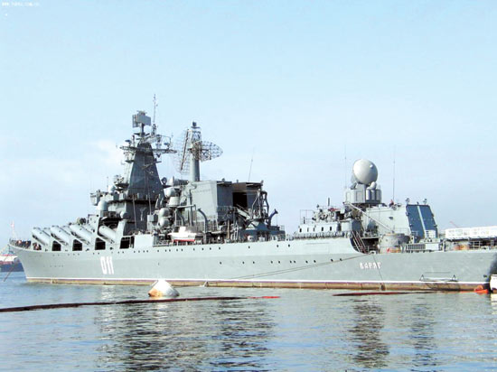 俄羅斯海軍也派出素有“航母殺手”之稱的“瓦良格”號(hào)導(dǎo)彈巡洋艦參加此次閱兵式。該艦已于13日從符拉迪沃斯托克的金角灣出發(fā)前往中國(guó)!巴吡几瘛碧(hào)是俄羅斯太平洋艦隊(duì)的旗艦,主要武器為16枚SS-N-12超音速反艦導(dǎo)彈,可攜帶1000公斤裝藥的常規(guī)彈頭或射程達(dá)300海里的戰(zhàn)術(shù)核彈頭。