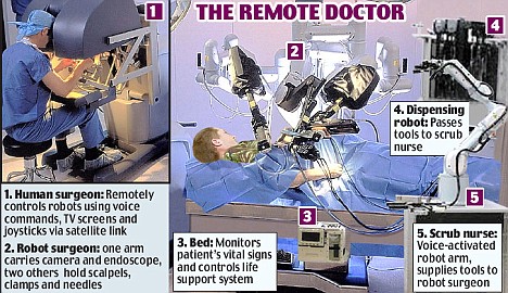 為了挽救更多士兵的生命,五角大樓已經(jīng)投資875萬英鎊,與美國加州斯坦福研究院下屬的高科技公司簽訂制造多功能機器人的合約,包括名為“療傷機”的機器人醫(yī)生。這種機器人有三條手臂,一條用來控制內(nèi)診鏡,讓人類醫(yī)生可以看到傷者身體內(nèi)部情況,另外兩條手臂則拿著外科手術(shù)工具。此外,還有一種“擦洗護士”機器人,負責為機器人醫(yī)生傳遞各種工具。這些機器人也能與病人交談,安慰他們,以及問他們一些問題。