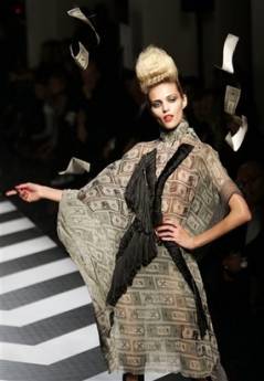 中新網(wǎng)3月10日電 據(jù)路透社報(bào)道,日前在法國(guó)知名時(shí)裝設(shè)計(jì)師高堤耶(Jean-Paul Gaultier)的服裝秀上,模特們身著用大把鈔票模樣堆砌而成的黑色禮服,而設(shè)計(jì)師克里斯汀-拉克魯瓦(Christian Lacroix)則設(shè)計(jì)出了巴洛克風(fēng)格的黃金禮服和大毛皮領(lǐng)。巴黎時(shí)裝展就是敢于走頹廢路線(xiàn)。