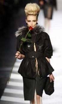 在設(shè)計(jì)師拉克魯瓦的時(shí)裝展上,今年的巴黎時(shí)裝展,童話(huà)般的長(zhǎng)袍已經(jīng)成為過(guò)去式,讓位給制作巧妙的打褶形平紋單面針織布上裝、女衫褲套裝和肩部褶皺的圓翻領(lǐng)毛衣。