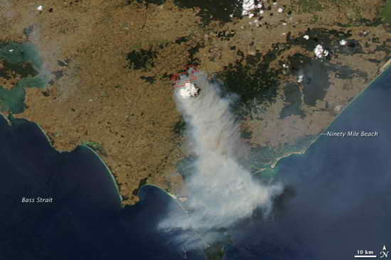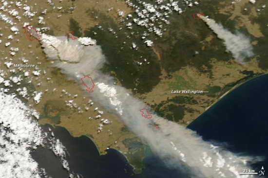 美國(guó)宇航局“阿卡”(取自拉丁文,意思是“水”。)衛(wèi)星中分辨率成像光譜儀所拍攝到的衛(wèi)星圖片反映了澳大利亞維多利亞州2月7日的山火情況,維多利亞州有多處發(fā)生山火(用紅色標(biāo)出)。由于受到大風(fēng)的影響,大團(tuán)煙霧正向東南方擴(kuò)散。澳大利亞?wèn)|北部的內(nèi)陸沙漠正在刮沙塵暴。新聞報(bào)道稱(chēng),這些山火是在數(shù)小時(shí)內(nèi)出現(xiàn)并快速蔓延的。