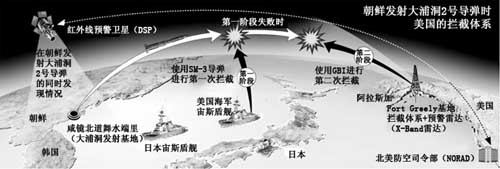 此外,韓國軍方預測,朝鮮如果發(fā)射能夠威脅美國本土的大浦洞2號改良型導彈,美國將分兩個階段予以攔截。大浦洞2號導彈發(fā)射后,朝鮮半島上空的美國紅外線預警衛(wèi)星(DSP)將首先發(fā)現(xiàn)情況。導彈尾部的火焰在太空中也能得到確認。預警衛(wèi)星將向美國的所有導彈防御體系發(fā)送警報。導彈升空后,第一階段的攔截體系開始運作。位于東海的美國海軍宙斯盾艦將通過相控陣雷達實時預測導彈的軌跡。如果大浦洞2號導彈接近日本列島,宙斯盾艦將發(fā)射SM-3導彈進行攔截。美國第7艦隊擁有夏洛號巡洋艦(CG-67)和斯特塞姆號驅逐艦(DDG-63)等九艘宙斯盾艦,一次可以發(fā)射多枚SM-3導彈。盡管日本海上自衛(wèi)隊的宙斯盾艦上也裝備有SM-3導彈,但是由于日本的和平憲法禁止自衛(wèi)隊在日本境外使用武器,所以在攔截導彈問題上受到了限制。
