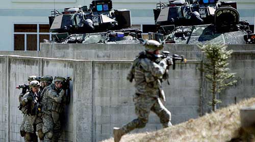 中新網(wǎng)3月11日電 據(jù)韓國《中央日報》報道,10日是韓美“關鍵決斷(key resolve)”聯(lián)合軍事演習的第二天,京畿道抱川駐韓美軍羅德里格斯(Rodriguez)射擊場上,韓美海軍展開巷戰(zhàn)訓練。美軍士兵正朝著假想敵軍占領的建筑物前進。