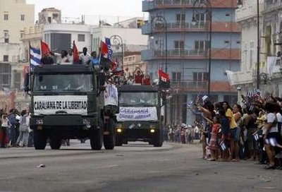 在厄瓜多總統(tǒng)柯雷亞的陪同下,古巴領(lǐng)導(dǎo)人、卡斯特羅之弟勞爾-卡斯特羅參加了在一處前軍事基地舉行的慶祝典禮。這處軍營(yíng)是卡斯特羅在1959年1月8日抵達(dá)哈瓦那后,向成千上萬(wàn)歡欣鼓舞的古巴人發(fā)表演說(shuō)的地點(diǎn)。
