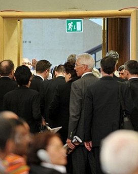 當他說到以色列借助二次大戰(zhàn)“猶太人的痛苦”成立國家時,包括英國及法國 大使在內(nèi)的幾名歐洲代表實時離場,以示抗議。法國總統(tǒng)薩科齊指摘內(nèi)賈德散播“仇恨言論”,要求歐盟各國采取強硬立場。聯(lián)合國人權(quán)專員的發(fā)言人亦批評內(nèi)賈德言論“不恰當”。會議期間也至少有3名小丑打扮、戴著七彩假發(fā)及紅鼻子的法國猶太學(xué)生組織示威者,在會場上抗議內(nèi)賈德,打斷其講話。