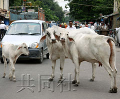 印度路上的牛很多是以前被飼養(yǎng)因產(chǎn)不出牛奶或變老而被拋棄,或是因放養(yǎng)而闖到路上的。在印度禁止食用作為神靈的“!比。就沒有人想要抓那些迷路的牛。即使那些牛在道路中間成為交通的障礙,在路上逆行,市民們也都會避開。