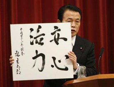 中新網(wǎng)1月6日電 據(jù)星島環(huán)球網(wǎng)報道,日本首相麻生太郎4日用了39秒鐘時間寫下了“安心活力”四個字作為自己新年的執(zhí)政目標,并于記者會上進行了公布。然而,這一舉動并沒有獲得國民的掌聲,卻很快引來了輿論的嘲弄,因為不少人認為麻生寫的四個字中,至少一個字是錯別字。