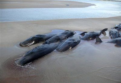 去年11月,150頭領(lǐng)航鯨在塔斯馬尼亞擱淺,雖經(jīng)救援人員全力搶救仍沒能使它們重回大海。就在一周多以前,60頭領(lǐng)航鯨再次在這一區(qū)域擱淺,救援人員只救活了其中的11頭。(陽光)