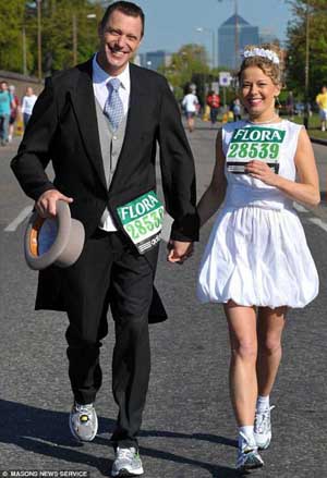 他們倆在比賽開始后七小時零五分鐘才跑到終點。新娘把花束擲向群眾時,新郎甚至有氣力支撐著她走過終點。皮特說:“這是我一生中最美好的一天,但我決定不再做這種事了!