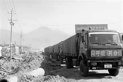 記者看到,這兩支車(chē)隊(duì)中既有拉運(yùn)物資的軍用汽車(chē),也有地方運(yùn)輸公司的大噸位加長(zhǎng)卡車(chē),還有載有建筑工人的中鐵建設(shè)集團(tuán)的專(zhuān)用運(yùn)輸車(chē)等,遠(yuǎn)遠(yuǎn)看去,車(chē)隊(duì)就像一條長(zhǎng)龍,一眼望不到尾。建筑大軍浩浩蕩蕩開(kāi)進(jìn)玉樹(shù)災(zāi)區(qū)的場(chǎng)景令記者既震撼,又振奮。