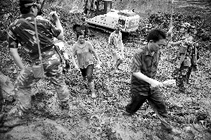 負(fù)責(zé)挖掘的武警交通直屬工程部的周偉表示,為了確保安全,避免次生災(zāi)害,大型挖掘機的挖掘工作到下午四點左右才開始。他說,為了保證遺體的完整,他們挖掘的時候都會非常小心。在現(xiàn)場,由于垮塌的直線距離幾百米,幾臺挖掘機分層次挖掘。挖出一大鏟泥土后,從高處落下,看是否有遺體存在。