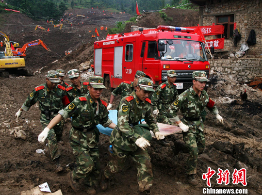 50個小時過去了,冒著山體隨時可能再次垮塌的危險,救援者從泥漿和碎石中搜救出六位被埋者的遺體。在30日下午發(fā)掘第五位失蹤者遺體時,在陽光下結板的泥漿和碎石讓官兵的救援行動異常困難,不到半小時間便敲斷了3根鐵鍬和一把榔頭。當失蹤者的遺體被挖掘出來裹上毛毯放上擔架后,記者看見旁邊手拿紅旗的一位武警戰(zhàn)士紅了眼圈。