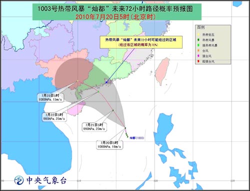 位于南海中部的熱帶低壓于19日晚上加強(qiáng)為今年第3號(hào)熱帶風(fēng)暴“燦都”,20日5時(shí)風(fēng)暴中心位于廣東陽(yáng)江東南方大約720公里的海面上,就是北緯16.7度,東經(jīng)116.2度,中心附近最大風(fēng)力有8級(jí)(18米/秒),中心最低氣壓為1000百帕。