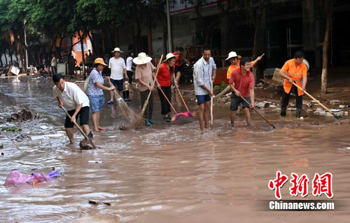 中新網(wǎng)廣安7月20日電(廖小兵 李勇) 20日凌晨,四川廣安城區(qū)160年難遇的洪峰慢慢消退,洪水過后,城區(qū)的清淤、防疫、災(zāi)后安置成了當(dāng)前抗洪工作的重中之重。當(dāng)?shù)匮杆俳M織機(jī)關(guān)干部、公安、消防、武警、志愿者以及受災(zāi)群眾近萬(wàn)人迅速投入到清理淤泥、防疫工作當(dāng)中,爭(zhēng)取早日恢復(fù)往日的生活秩序。