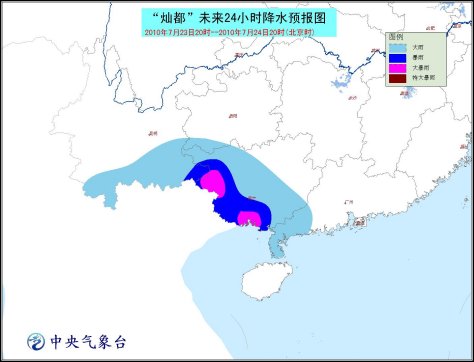 受“燦都”減弱后的低壓和西南季風(fēng)的共同影響,23日晚上到24日白天,北部灣、廣西沿海仍將有6-7級大風(fēng),陣風(fēng)可達(dá)8-9級;廣東西南部、廣西中南部和西部、云南南部和西部、貴州西南部等地有大雨或暴雨,其中,廣西西南部和南部的部分地區(qū)有大暴雨,局地有特大暴雨。