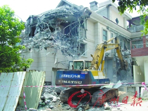 記者看到,經過兩日的強拆,宏達徑26號違建別墅面向小區(qū)的墻體已經全部拆除,別墅內部2層和3層樓板和隔墻也已支離破碎,別墅中部被拆出了一個大凹洞,大量鋼筋和鋼材懸露在外。